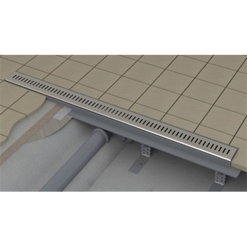 Такой канал имеет конструкцию, состоящую из лотка, в который собирается вода, опор, сифона и декоративной решетки. Используя душевой поддон, нужно существенно снизить высоту помещения ванной комнаты. Для того, чтобы монтировать дренажный трап и проложить коммуникации, потребуется поднять пол на 90 мм. Эта незначительная прибавка в высоте позволит оборудование помещение теплым полом. Сам же уклон, направленный к дренажному каналу, изменится незначительно. Маленький перепад не потребует резать плитку по диагонали в разных плоскостях, а поверхность выглядит идеально ровно.