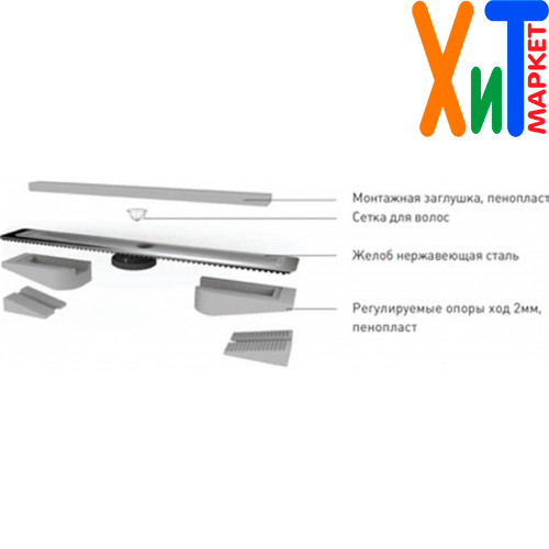 Комплект Душевой желоб - 1 шт.Решетка - 1 шт. Сифон - 1 шт. Комплект опор - 1 шт. Прокладка гидроизолирующая - 1 шт. Инструкция - 1 шт.