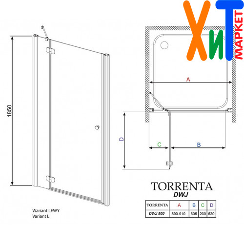 Душевая дверь в нишу Radaway Torrenta DWJ 90 прозрачное стекло L