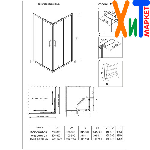 Душевой угол Veconi Rovigo RV-83, 900x900x1950, Брашированный алюминий, стекло прозрачное